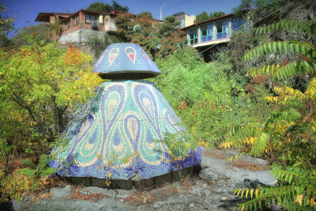 I had seen a clearly abandoned building perched on a bluff high above the Mtkvari river, and decided to try to find my way there. A narrow path led down from the neighborhood street and through some brush. Odd ceramic cones came into view, and deepened the mystery: what was this place?