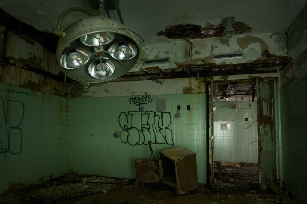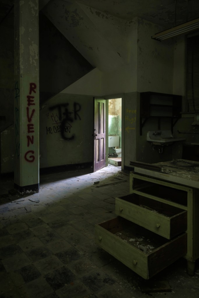 Last summer’s road trip brought me here to see what I could find. I rolled into town in the late afternoon, with enough time to drive around the hospital and do some scouting. The next morning, up before the sun, I found an inconspicuous spot to leave the car and made my way toward the campus. This corner of the town had once seemingly been housing for doctors or administrators. Now, like the hospital itself, these homes sat unused.