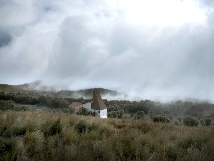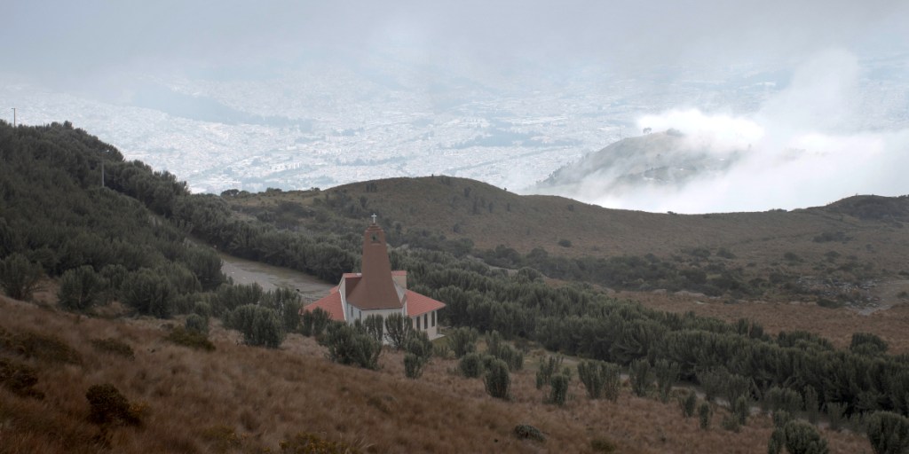 The Teleferiqo is a cable car that takes you up to one of the surrounding mountain tops for a panoramic view of the city. I wanted to get there towards sunset for the best light, which was a mistake. I would learn that the weather in Quito this time of year usually starts with dazzling sunshine before clouds roll in promptly towards sunset. During the 15 minute ride up to the top, I watched blue sky suddenly give way to gloom. Consequently I didn’t get any great twilight panoramas of the city, but I took a few looking down the other side of the mountain, where a couple churches stood out against the backdrop of quickly encroaching clouds.