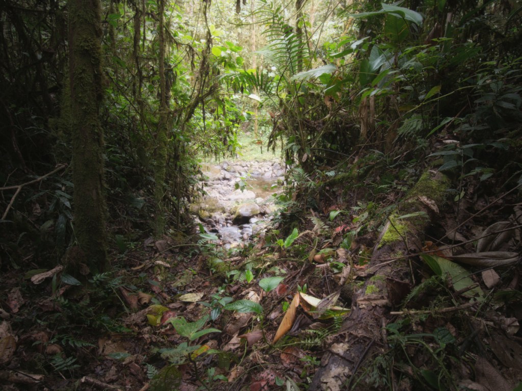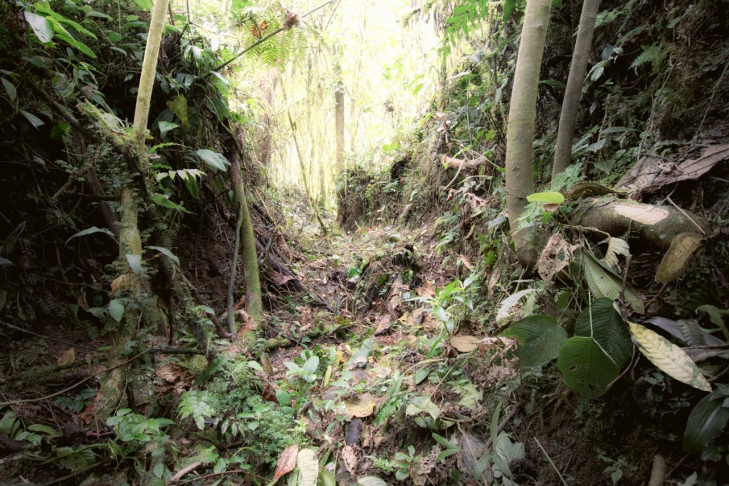 Culuncos were a network Andean footpaths, taking the form of trenches dug into the ground to a depth of roughly five feet. This kept them pleasantly cooler than the surrounding jungle and kept travellers on them hidden from potential enemies. They were often paved with cobblestones, though Rolando had not gotten far enough in his clearing efforts to ascertain whether this was the case with the one on his land. It was an awesome experience to get to be the first outsider to stand in this bit of native history, though admittedly it was a tough subject to shoot. Foliage and dim light often made for flat images, but I think I was able to get a couple that worked. In both of these, the deep ‘U’ shape of the path can be discerned, and in the second the outlet to a river crossing is also visible.