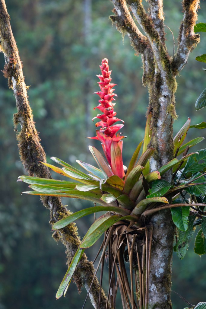 The trees are dotted with bromeliads, a type of air plant and cousin of the pineapple. Rather than take root in soil, air plants grow on tree branches. The bromeliad sprouts a nest-like tuft of leaves, from which juts its brightly colored flower.