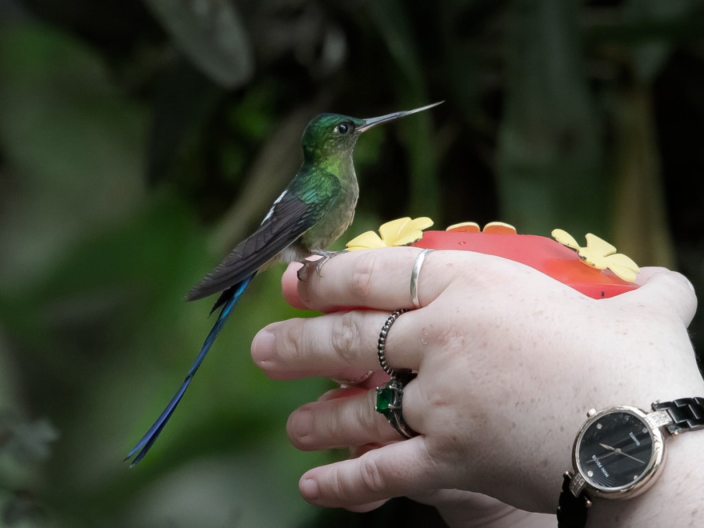 The locals have a neat trick to wow city slickers like us. First, all the hummingbird feeders are collected and put away, save one which is given to the tourist, in this case my wife Shawna, to hold. At first, the birds are upset that their smorgasbord has been taken away, but soon the braver ones will notice the remaining feeder. If it is held still, the hummingbirds will soon to perch on the tourist and feed. It’s quite a sight.