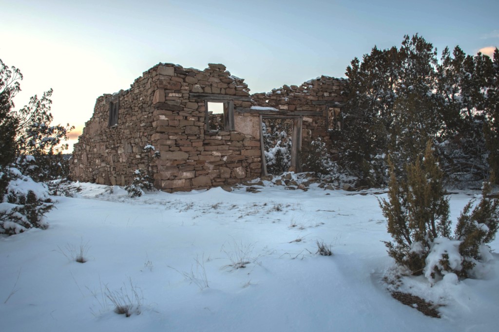 I’d read about a funky little abandoned area in Ojo de Vaca, about an hour’s drive from town. Once the snow subsided I set out to get there. The drive took me first down a highway, then a secondary road, then a tight, winding two lane ribbon of asphalt, then, finally an unplowed dirt road. In places there were no fresh tire tracks in the snow, indicating I was the first to drive here in at last 48 hours. I was glad to have the SUV, as it handled well through the snow drifts, some of which were at least a foot deep.