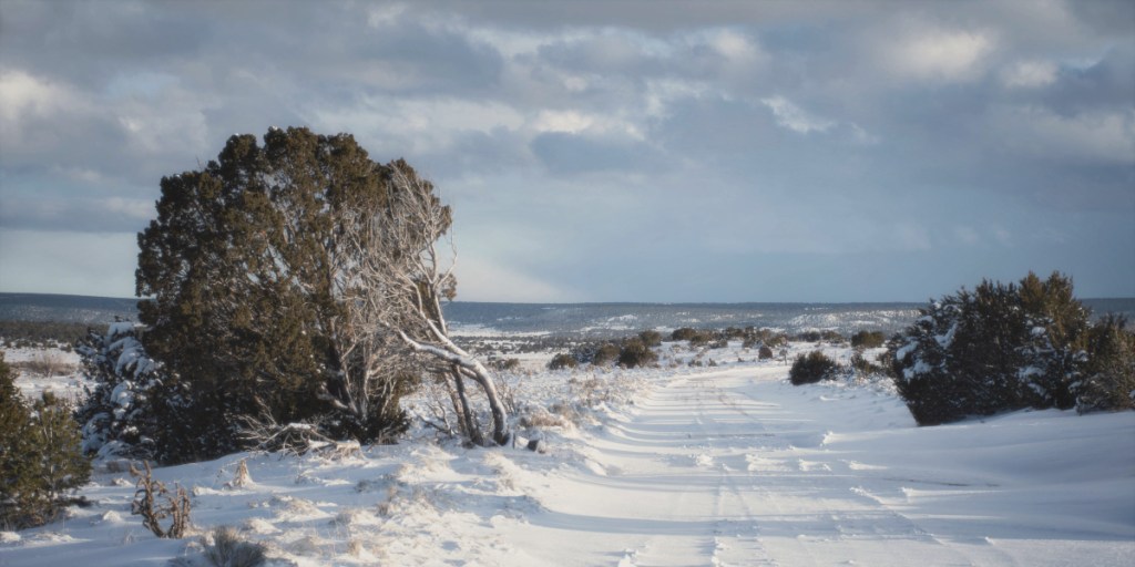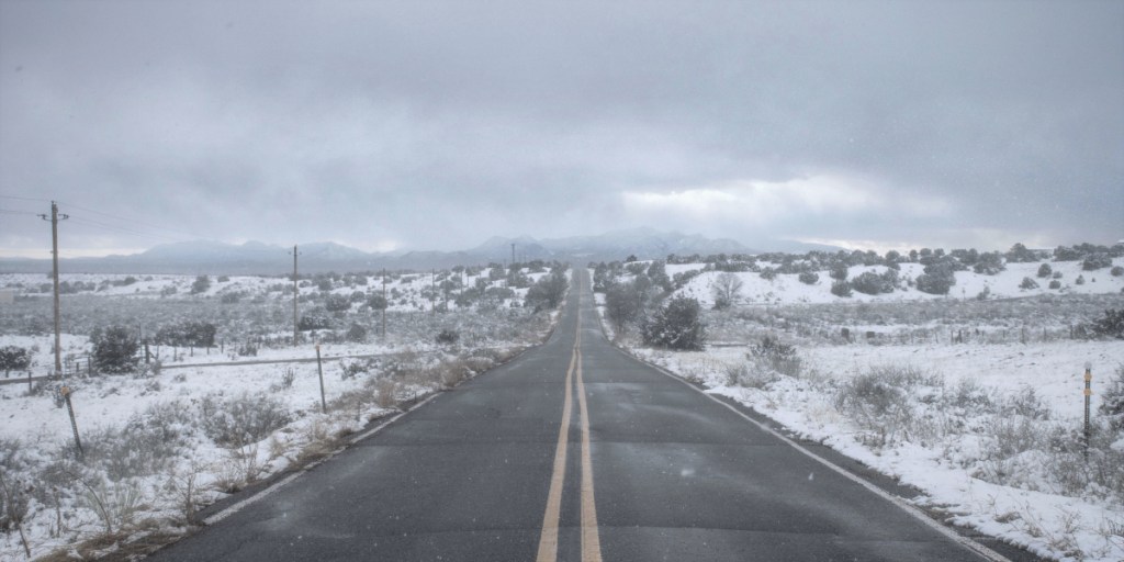 It continued snowing, on and off, for next couple days, though without much accumulation. We drove out into the desert to see what we could find. I tried my hand at one of the great photography tropes of the American West: the lonesome straight road leading to the horizon.