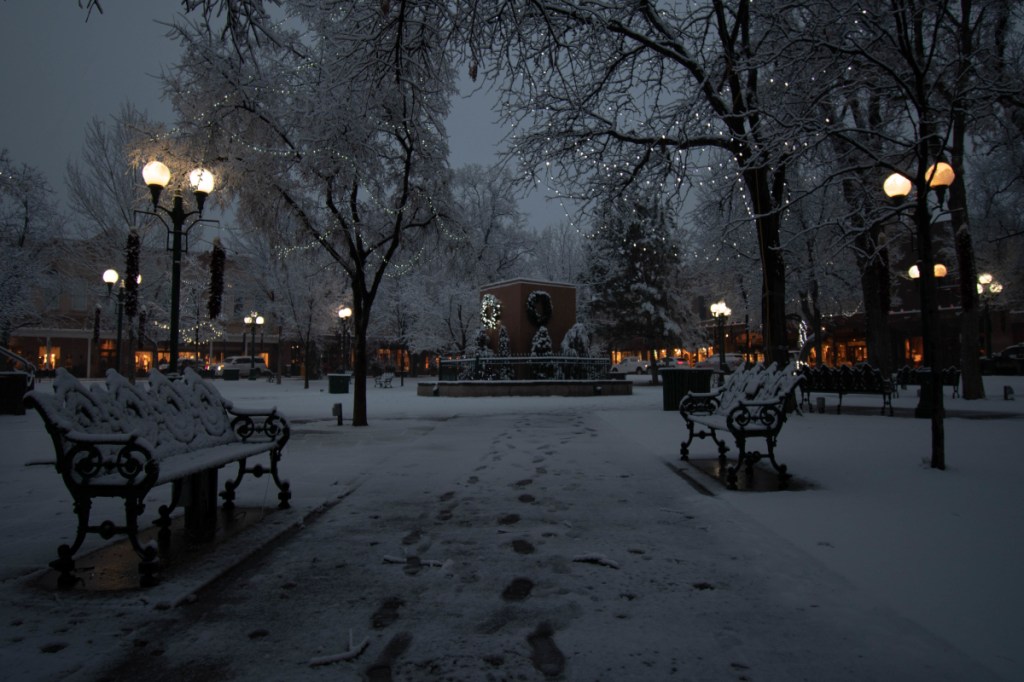 Below is the historic Santa Fe plaza in the center of town in twilight gloaming.
