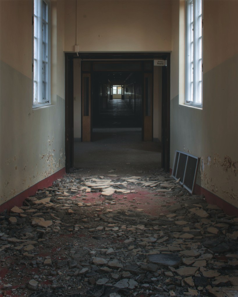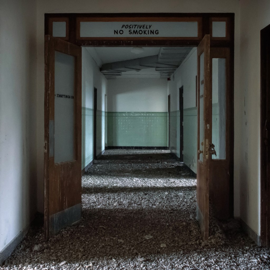 Below it, the top floor was a veritable pigeon roost. It was difficult to spend much time here because of the sheer amount of bird droppings on the floors, but I ventured through if only to capture the surgery ward, with its reminder that there was a time when hospitals had certain special areas where smoking was not allowed, unlike the rest of the world. The hallway shot I think also proves that I’m not exaggerating about the pigeon problem.