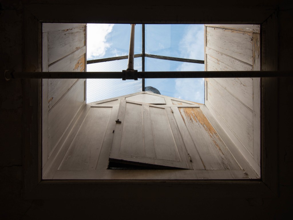 For many urban explorers, the often transgressive nature of this pursuit seems to be the primary selling point. And, though there is something decidedly exhilarating in breaking into an old building unnoticed and stealthily photographing it, I don’t relish the risk of being arrested and imprisoned for my efforts. To those that would say that paying for a tour of a place like St. James is a cop out, I’d argue that it’s hard to beat a scenario where you get practically free run of the place, with a friendly and knowledgeable host to show you around. As it turned out, our guide’s name was Cameron. He was about thirty years old and had bought the property outright a couple years previously. He’d since managed to get the hospital in a state of arrested decay, and was slowly working on rehabbing and restoring it. He even had one tenant living on site already: a young man and his dog. Cameron’s passion for old architecture in general and St. James in particular was apparent, and the four of us formed a sort a sort of symbiotic relationship: he enjoyed telling us stories of the building and the work he’d been putting into it, and in turn he found in us a rapt audience. Thus the promised two hour tour slowly turned into three and a half, with an invitation to come back again while we were in town and visit again, this time as friends. We took him up on his offer the next night and came back with pizza and beer which we enjoyed outside on one one of the hospital’s outdoor mezzanines.
