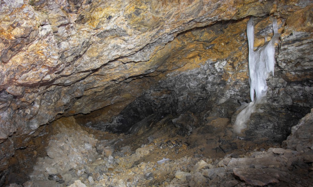 As we hiked past it and downhill, we came around to the hillside in which a mine shaft opening was clearly visible. Moreover, it seemed to be easily and (relatively) safely accessible. So I’ll end this post here, inside the only underground portion of a mine we were able to gain access to. The first shot made me regret not posing in it; without a frame of reference it’s tough to make out what one is looking at here, although I believe the icicle mass in the right of the frame was about four feet tall. It’s about halfway down the approximately 200 foot long, gently sloping horizontal shaft. The dark patch is the deepest end of the mine. The second shot is looking back towards the entrance, the fog visibly hanging at ground level even as the floor of the mine drops away from it.