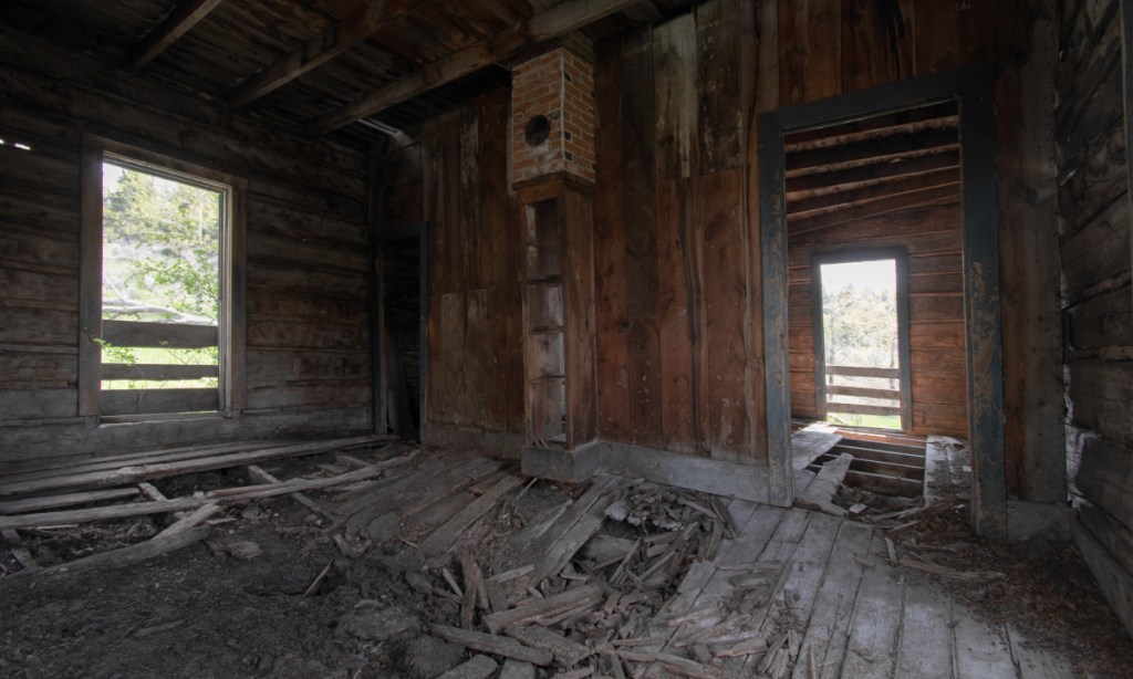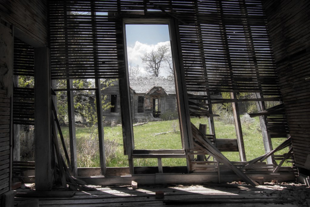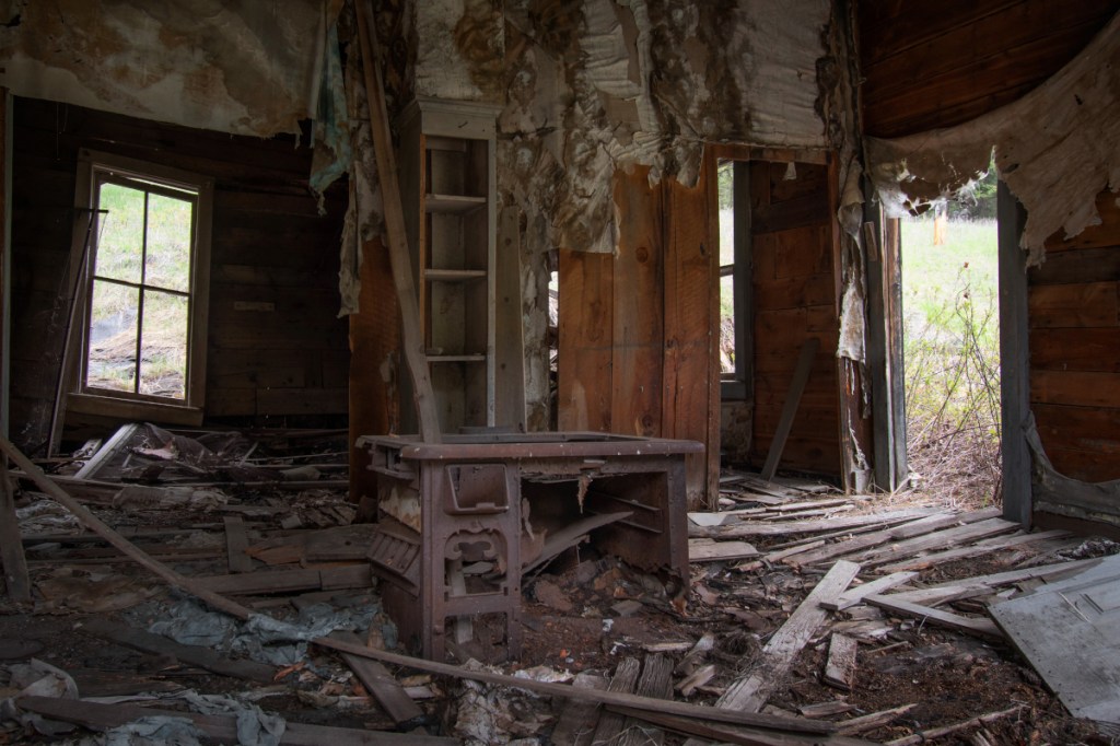 The insides usually didn’t have much left behind, save for stoves and an occasional piece of furniture. In one case, a building’s sagging framework itself framed the house next door in a unique way.