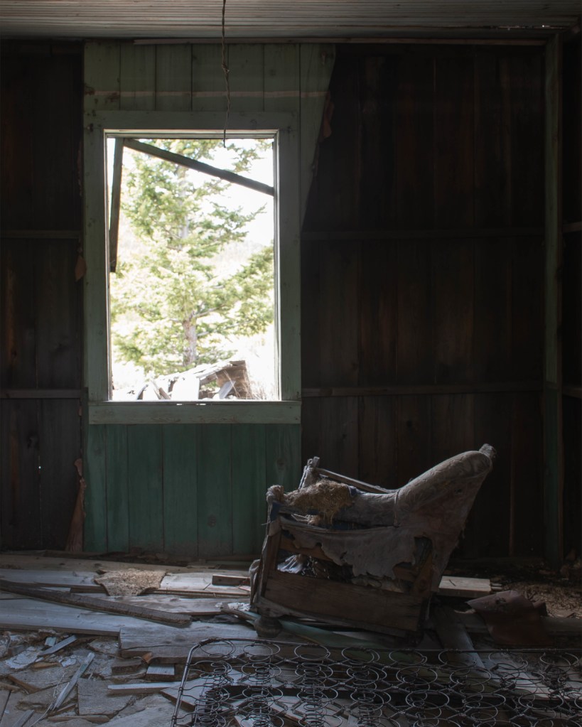 The only way into the cabin pictured below was so treacherous, I decided to take this shot of the armchair standing on my tiptoes while looking through a window.