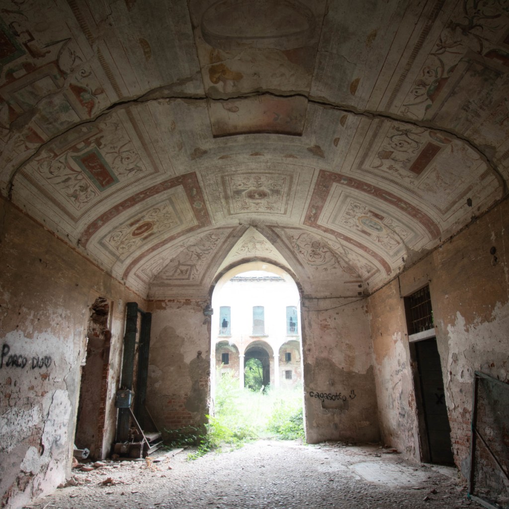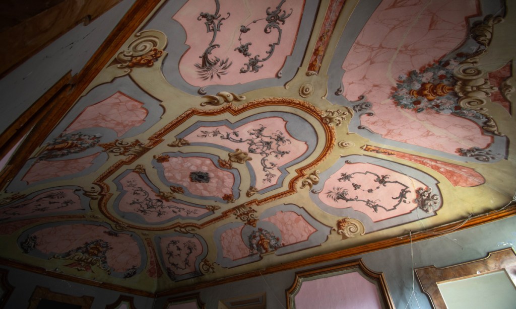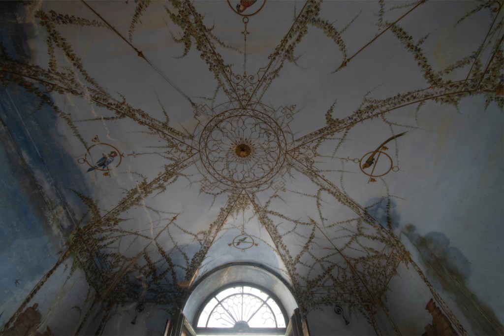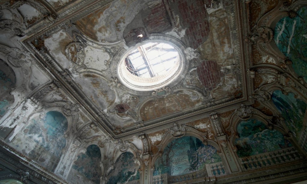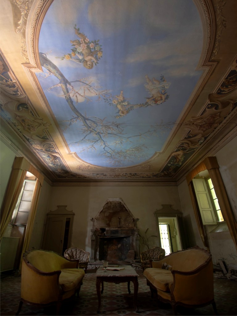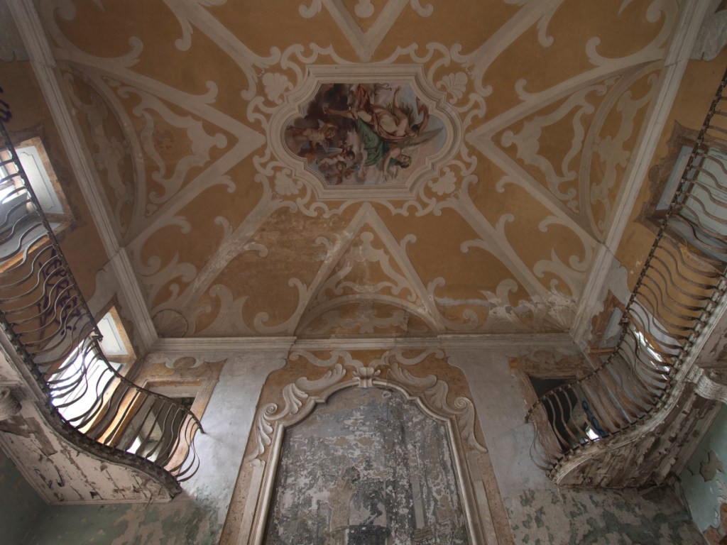 Posh Italians seemed to abhor plain ceilings, and would often decorate them intricately with murals or plaster. This was especially true in the main entry halls, which would be ornately decorated even in cases where all the other rooms were sober white boxes. These halls are calling cards of sorts for these villas among the urbex community; sometimes the only photos of the entire property easily available online are of its main hall. So we’ll start here and make the dazzling old ceilings of Italy the focus of this post.