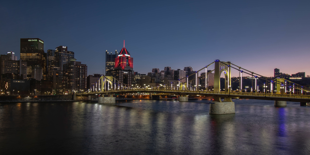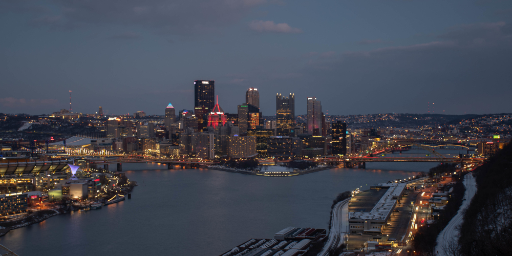 Pittsburgh lays at the confluence of the Allegheny and Monongahela rivers which, in turn, forms the Ohio. The heavily built-up downtown sits right at the tip of the spear of land formed by this confluence, and is surrounded by fairly hilly terrain, particularly to the south. All this means that certain vantage points around town give you the kind of dramatic shots of the cityscape you’d normally need a drone for. The first of these was from the back deck of our airBnB, which had sold us on the promise of million dollar views. I think it delivered! The weather was rough when we arrived in town late at night, but this was the snowy view of downtown that greeted us.