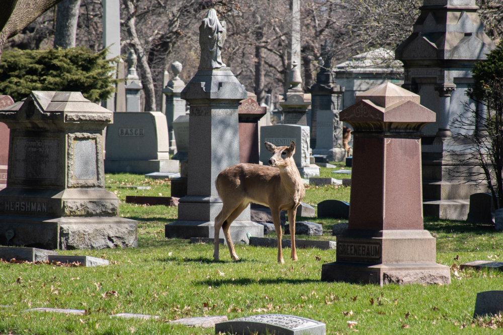Last weekend I visited this old cemetery located on the far north side of Chicago. Like its better known counterpart, Graceland, it is the final resting place of many famous Chicagoans. On the morning we were there, its leafy, park-like setting attracted many joggers and others just out for a stroll, as well as a family of deer.