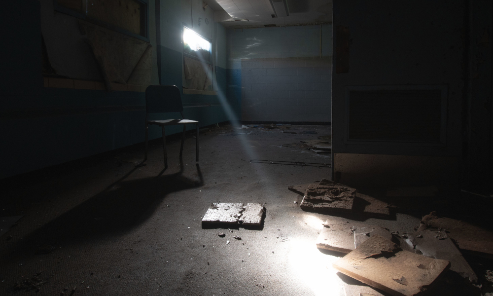 We did get inside, but shooting conditions inside were rough. Mostly you had to rely on your own, as seen in the photo above. But in a few places, a break in the boardup let in a furtive and dramatic shaft of light. The spot below is where we spent the most time and exposures, and yielded what I think was my favorite shot of the trip.