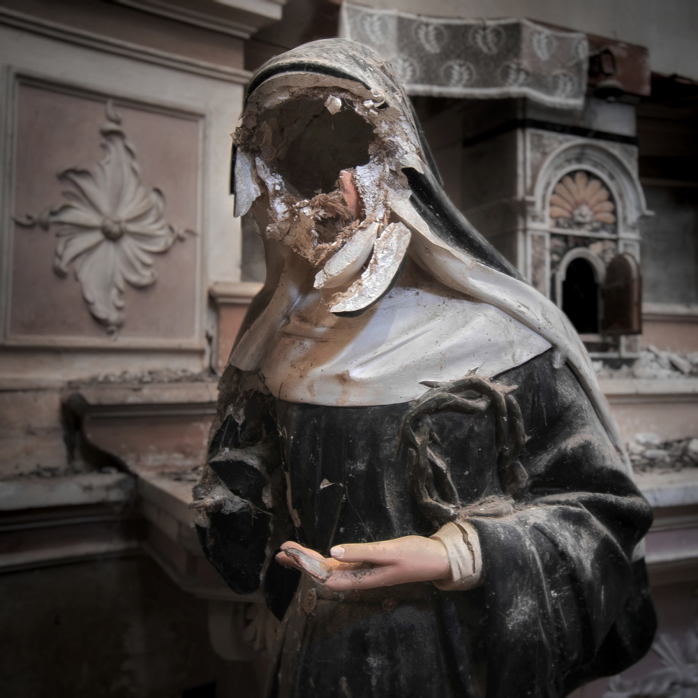 Finally, several statues around the altar had been defaced, this one quite literally, making for this haunting apparition.
