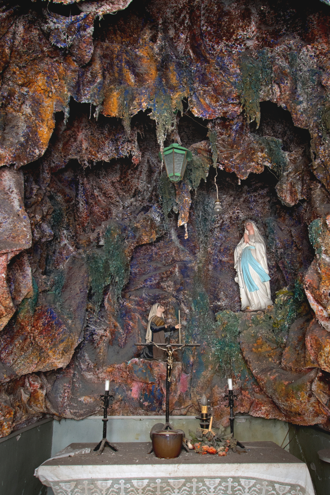 Through the scaffolding on the right aisle I thought I saw a dim glitter. When I got closer and lit it with my flashlight, I saw that it was a diorama showing Our Lady of Lourdes appearing to the little girl in the grotto. The scene was simply crafted out of many rags, stiffened with sparkling paint of many colors, and hung in layers to look like the jagged walls of a cave.