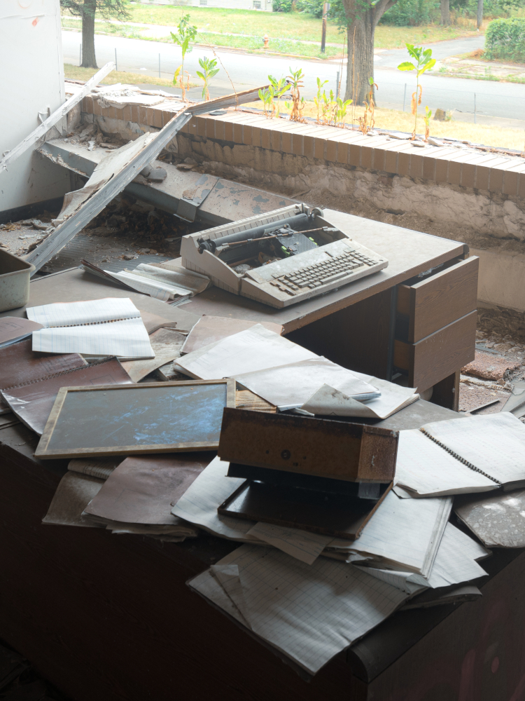 Other shots from the school: the same staircase a floor lower, and one of the classrooms with no windows, just fully exposed to the elements for decades.