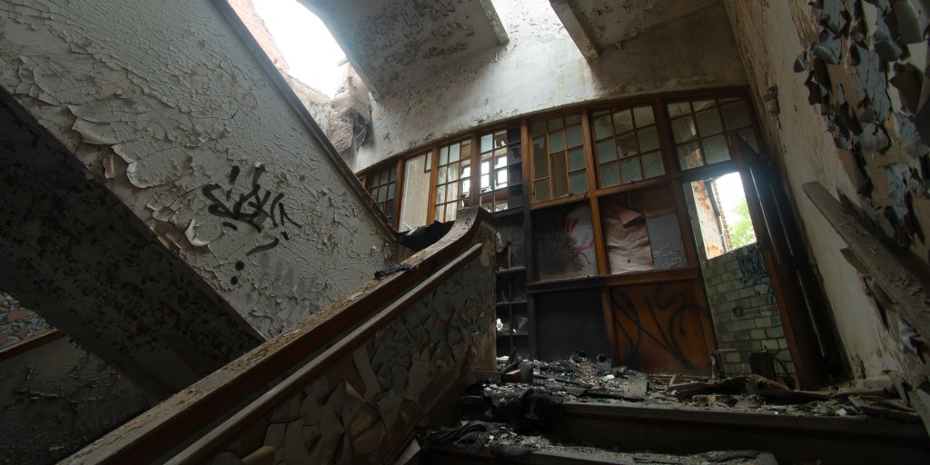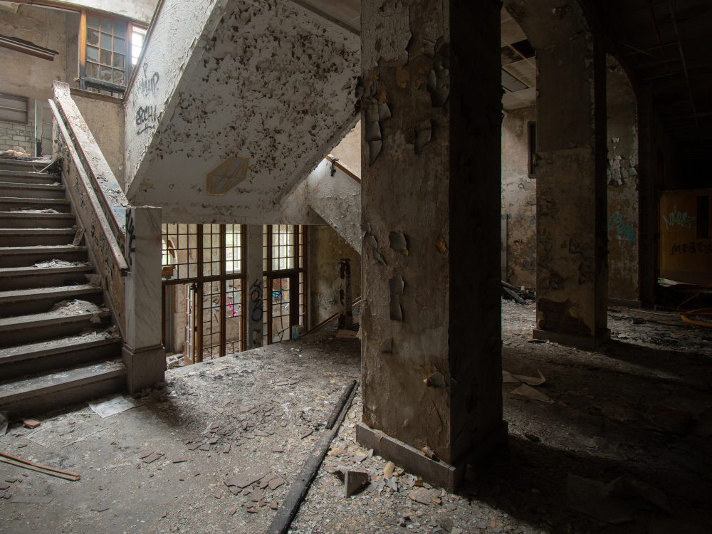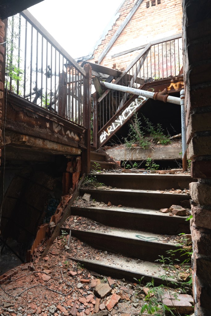 After that, it was just trying to cram as much of the best sites in town for my friends to see in the time we had left. One stop that was somewhat sad for me was the old Emerson High School; I had forgotten that it was the victim of arson a while back. Much of the building remains intact (or, at least in a state not appreciably worse than before the fire) but the attic is just… gone. It had been crammed with textbooks and junk, but the walls were covered by student graffiti, each featuring a name and graduation year. Seen below is the staircase leading up to the attic, just a half flight from the ashes.
