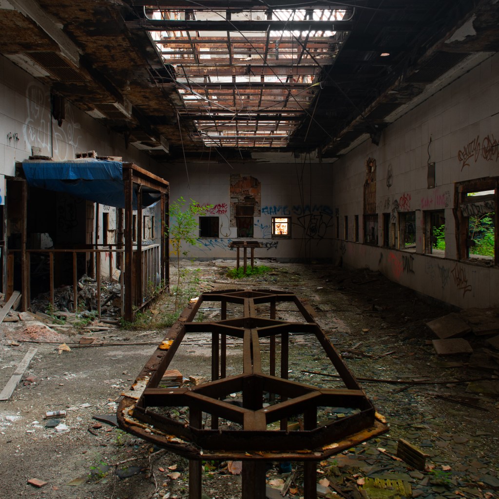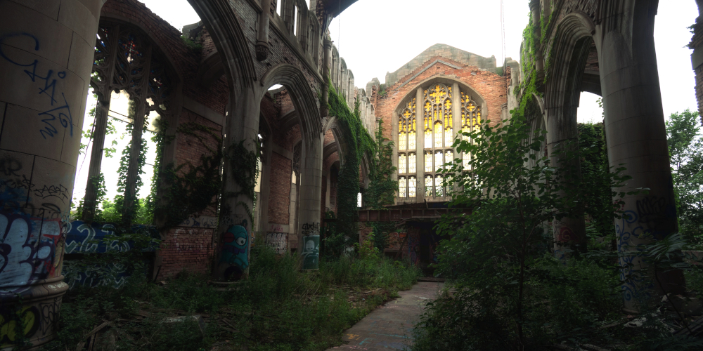 My friend Holly was in town with her husband, and we met up for an urbex day. We started on an abandoned stretch of route 66 (featured in the last post), then spent the rest of the day shooting in Gary. Our first step was the famous First Methodist Church downtown. Here’s a shot of the nave with most of the roof now gone.