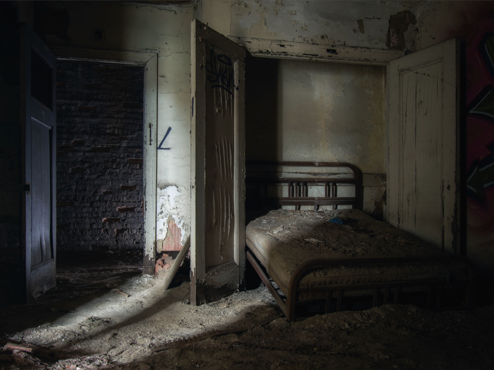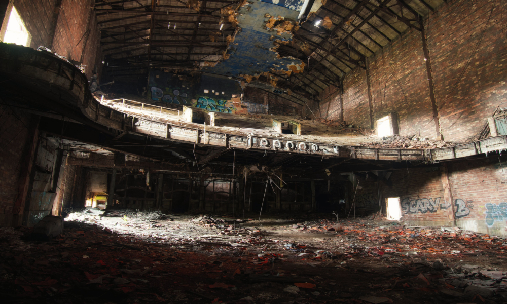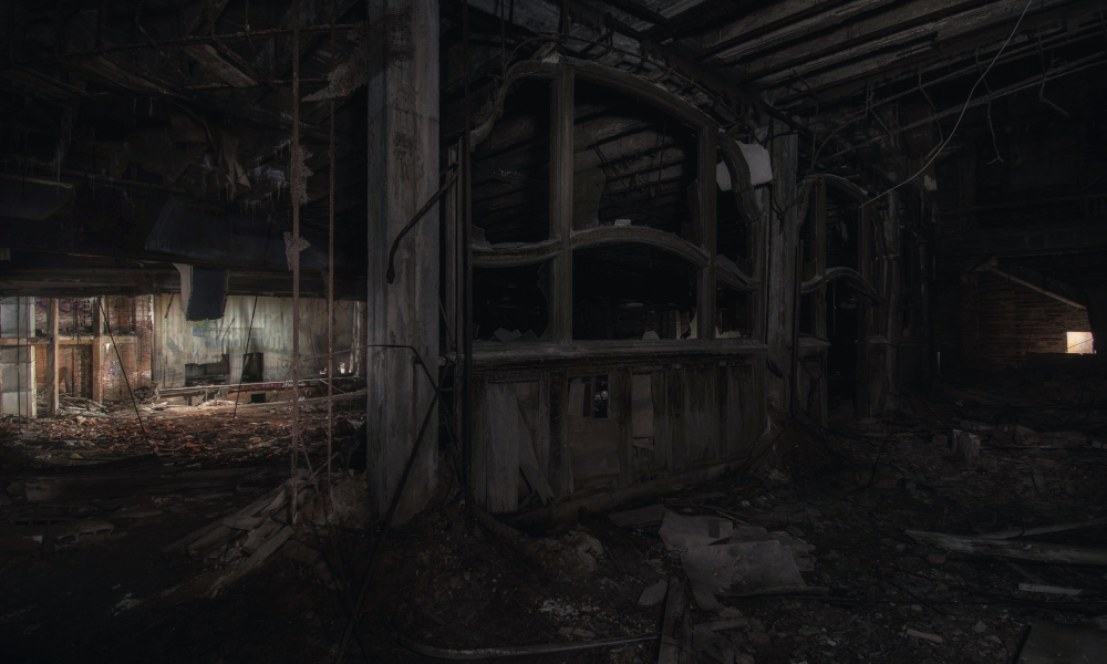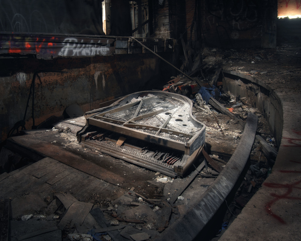 But it was the old theater where I had the best luck. It is another place I’ve visited many times, but it was always so dark that it was hard to even get any decent shots of the scant remaining architectural details that remained. But with more decay, more light has seeped in, and we wound up exploring more of the building than I had ever done previously. Finally got a decent shot of the old piano in the orchestra pit, and, among other things, found an entire wing of apartments with murphy beds in one section of the building. A theater would be a strange place to live, so my guess is these were quarters for performers passing through town, but I can’t say for sure.