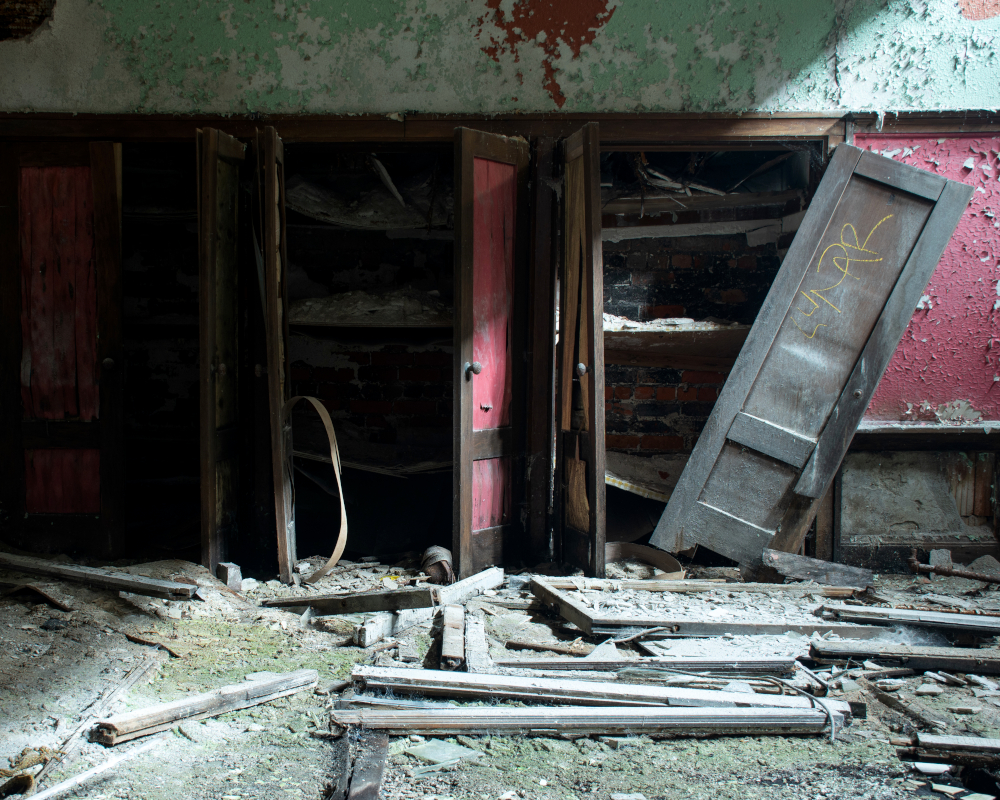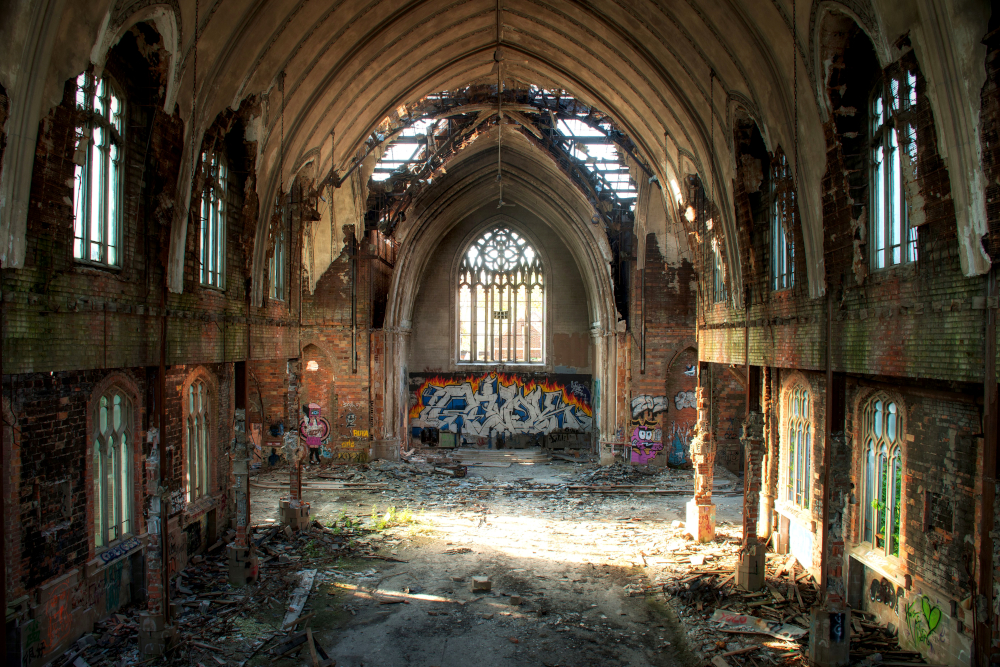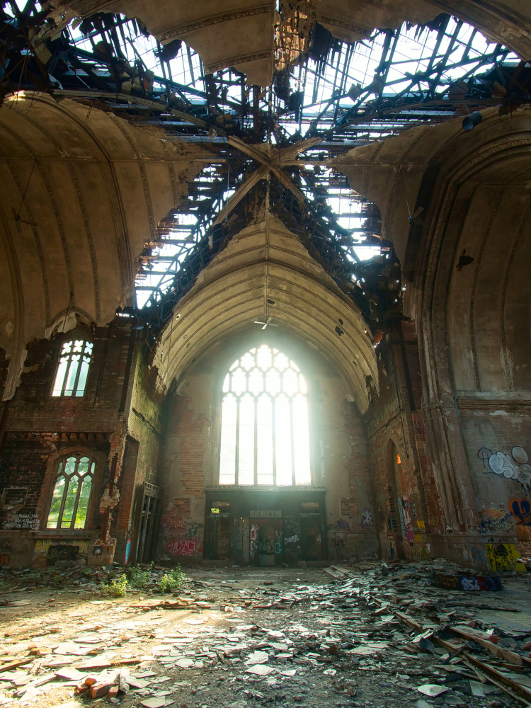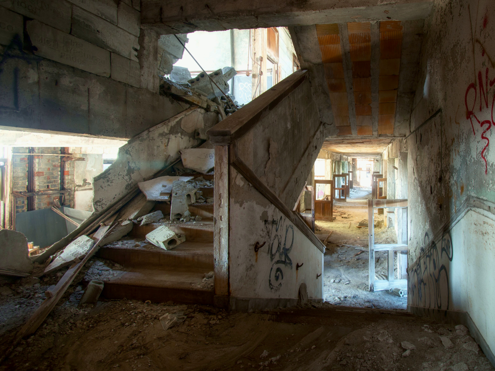 Next, a very ruined hallway shot, followed by the view from the top story auditorium
