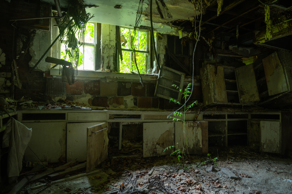 The rectory was in very bad shape, but I did like this basement kitchen tinted green from the light filtering through the foliage choking its windows. And, of course, the little pioneer sapling growing out of the linoleum.