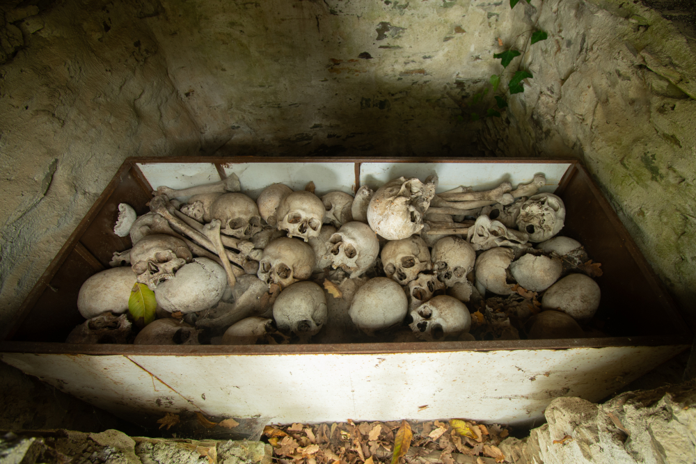 I would never act on this impulse, but the thought of bringing home a very morbid souvenir did cross my mind while setting up this shot. But just as with the church earlier, I wonder at the fact that these things, left wide in the open, have not been stolen or vandalized.