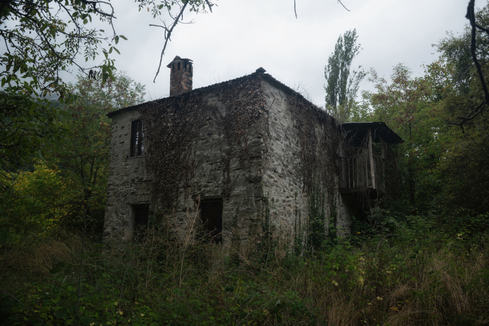 This ghost town lived up to its name on our visit, with the midday sun obscured out by the thick clouds and fog. We parked by the old mill (which sadly wasn’t very photogenic) and crossed the river that runs through the gorge on a pedestrian bridge. From here, the village rose up along the hillside opposite. We would spend the next few hours here exploring as much of it we could.